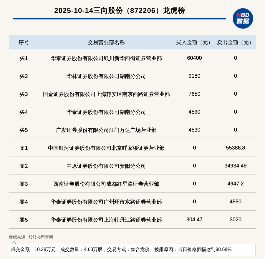 每經(jīng)訊,2025年10月14日,新三板創(chuàng)新層公司三向股份(872206,收盤價:3.02元)登上龍虎榜,交易方式是集合競價,披露原因是當日價格振幅達到98.68%,成交數(shù)量4.63萬股,成交金額10.28萬元。買一席位為華泰證券股份有限公司銀川新華西街證券營業(yè)部,買入6.04萬元;賣一席位為中國銀河證券股份有限公司北京呼家樓證券營業(yè)部,賣出5.54萬元。
