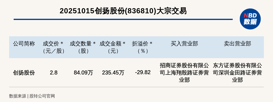 每經(jīng)訊,2025年10月15日,新三板創(chuàng)新層公司創(chuàng)揚(yáng)股份(836810,收盤價(jià):3.99元)發(fā)生一筆大宗交易,成交價(jià)2.8元/股,成交數(shù)量84.09萬股,成交金額235.45萬元,折價(jià)29.82%。買入營業(yè)部是招商證券股份有限公司上海翔殷路證券營業(yè)部,賣出營業(yè)部是東方證券股份有限公司深圳金田路證券營業(yè)部。